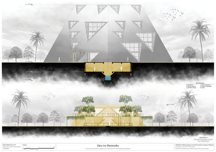 The design proposal for the adjacent pavilion, envisioned as a community kitchen draws direct inspiration from the architectural language of the planetarium. Through a thoughtful interpretation of its geometry, structural clarity, and expressive elements, the pavilion aims to seamlessly integrate into the context while establishing its own identity.