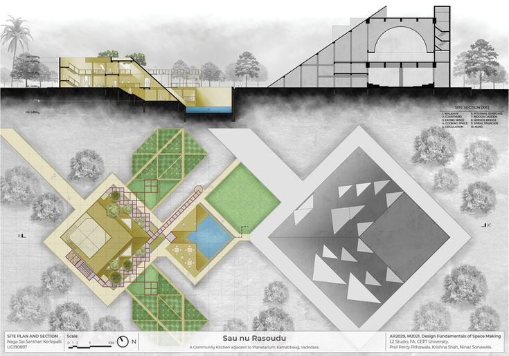 The bold use of red-colored steel structural elements contrasts with the subdued grey concrete, injecting vibrancy and visual intrigue. The circulation is designed as an experiential journey, beginning at the approach road near Kalagoda Circle, meandering through the community kitchen, around the Kund, and culminating at the planetarium - fostering a deeper interaction with the landscape and the built environment.