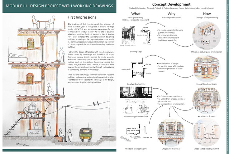 Elements such as jharokhas, overhangs, and otlas which cast comforting shade and create spaces for interaction along narrow lanes inspired key design decisions. These architectural features not only regulate climate but also nurture informal social encounters. I integrated similar ideas into the bed and breakfast to retain the charm and communal essence of the Pol, allowing guests to experience the unique balance between enclosure and openness.